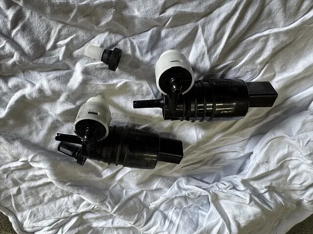 今回は、「ウォッシャー液低下」のエラーメッセージが出たとのことで、ご入庫いただきまして、確認をしたところウォッシャー液を吸い上げる「ポンプ本体」の経年劣化で漏れが発生しておりました。ポンプはプラスチックの成形品であり、モーターの振動や液体の温度変化によって、本体の継ぎ目やグロメット(ゴムパッキン)から亀裂が入ります。そこからポタポタと漏れ出し、フロントバンパーの右側や、ヘッドライトの後ろあたりからから漏れの確認ができました。