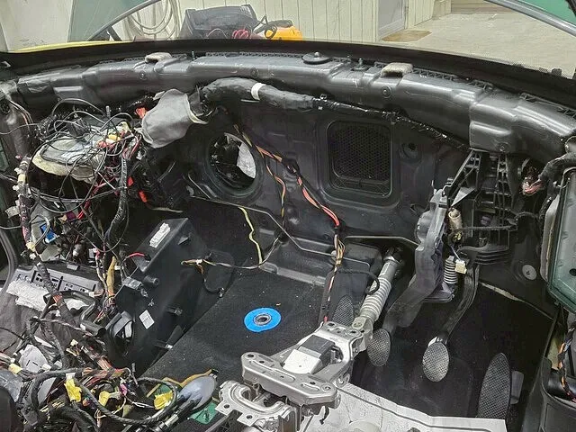 ミニのダッシュボードは非常にタイトで精密に組み上げられています。ダッシュボードを下ろすには、ステアリング、オーディオ、各種スイッチ類、エアバッグ、そして複雑に張り巡らされた配線コネクタをすべて外さなければなりません。作業時間は丸2日以上に及ぶこともあり、一度バラすと走行中に「キシキシ」といった内装の異音が出やすくなるリスクもあり、技術者の熟練度が問われる非常にシビアな作業なのです。