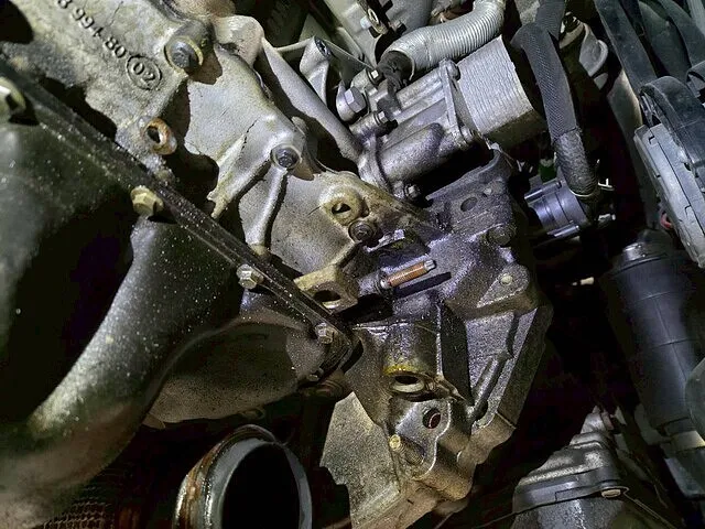 このパーツはエンジンの前面、ちょうどエキゾーストマニホールドとターボチャージャーの裏側に隠れるように配置されています。そのため、上からエンジンルームを覗き込んだだけでは漏れ箇所が特定できず、「どこから漏れているのか分からない」という不安を増大させる原因となっておりますので、下廻りの確認が必須となります。